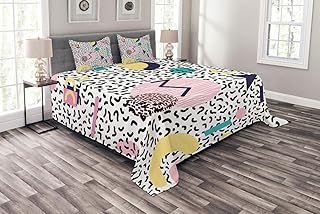 Ambesonne 90年代ベッドスプレッド レトロスタイル ラウンド半月三角形アートワーク 装飾キルト 3点セット 枕カバー2枚付き クイーンサイズ ネイビーイエロー