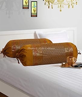 Stylo Culture インディアンポリデュピオン 円筒形ホットドッグ枕 ボルスターピローカバー ゴールドジャカードブロケードボーダー フローラルラージセット シリンダークッションカバー(2枚セット) 30x15インチ(76x38cm)