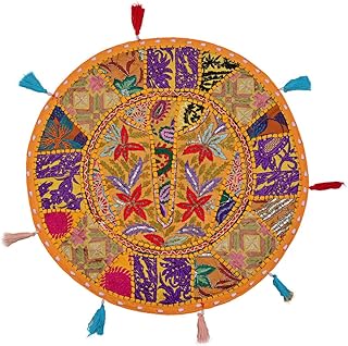 Stylo Culture インディアンフロアクッションカバー ビンテージパッチワーク ボヘミアンシーティング マンゴーイエローラウンドスローピロー 18 スモール装飾装飾 シーティングタフェットシート プーフカバー フットスツール コットン刺繍 1 ピース