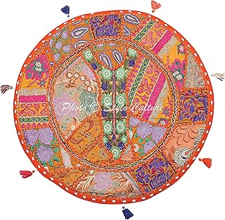 Stylo Culture エスニックラウンドスローピロー ベッド用 ヴィンテージパッチワーク フロアクッションカバー オレンジ スモール 18x18 装飾装飾 シートタフェットシート プーフカバー フットスツール コットン刺繍 1ピース