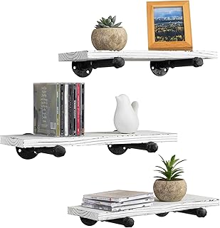 MyGift アーバン ラスティック ホワイトウォッシュ ウッド&メタルパイプ 壁掛け フローティングシェルフ 3個セット