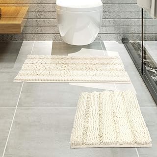 厚手ストライプ シャギーバスラグ バスルーム用 ノンスリップ2枚セット バスルームラグ エクストラソフト 吸収性 シェニール糸ラグマットセット 浴槽 シャワー キッチン 20 x 32 Plus 17 x 24インチ アイボリー