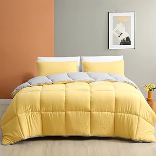 Cobnom Cloud リバーシブル掛け布団 通気性 人工羽毛 マイクロファイバー 掛け布団 掛け布団 掛け布団 ソフト 起毛シェル 3ピース オールシーズンベッド掛け布団セット (キング イエロー/グレー)