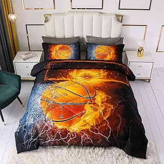 バスケットボール ファイヤー掛け布団 スポーツテーマ 掛け布団 3個 3D 視覚効果 絶妙なボールパターン 超ソフト お手入れ簡単 掛け布団 活力 ティーンエイジャー 部屋 装飾 クイーンサイズ (90インチ x 90インチ)