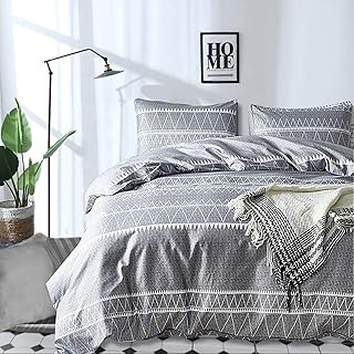 Andency ホワイト ボーホー 掛け布団 クイーン (90x90インチ) 3点 (三角形幾何学ストライプ掛け布団1点 + 枕カバー2枚) ソフト マイクロファイバー ボヘミアン 人工羽毛布団セット