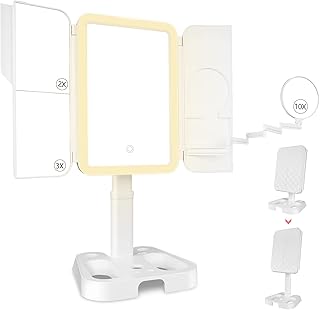 GoHoKi ライトアップメイクアップミラー 高さ調節可能 10 X 3 X 2 X 1 拡大鏡 72個の調光機能付きLEDライト付き 3色照明付きバニティミラー タッチコントロールデスクミラー